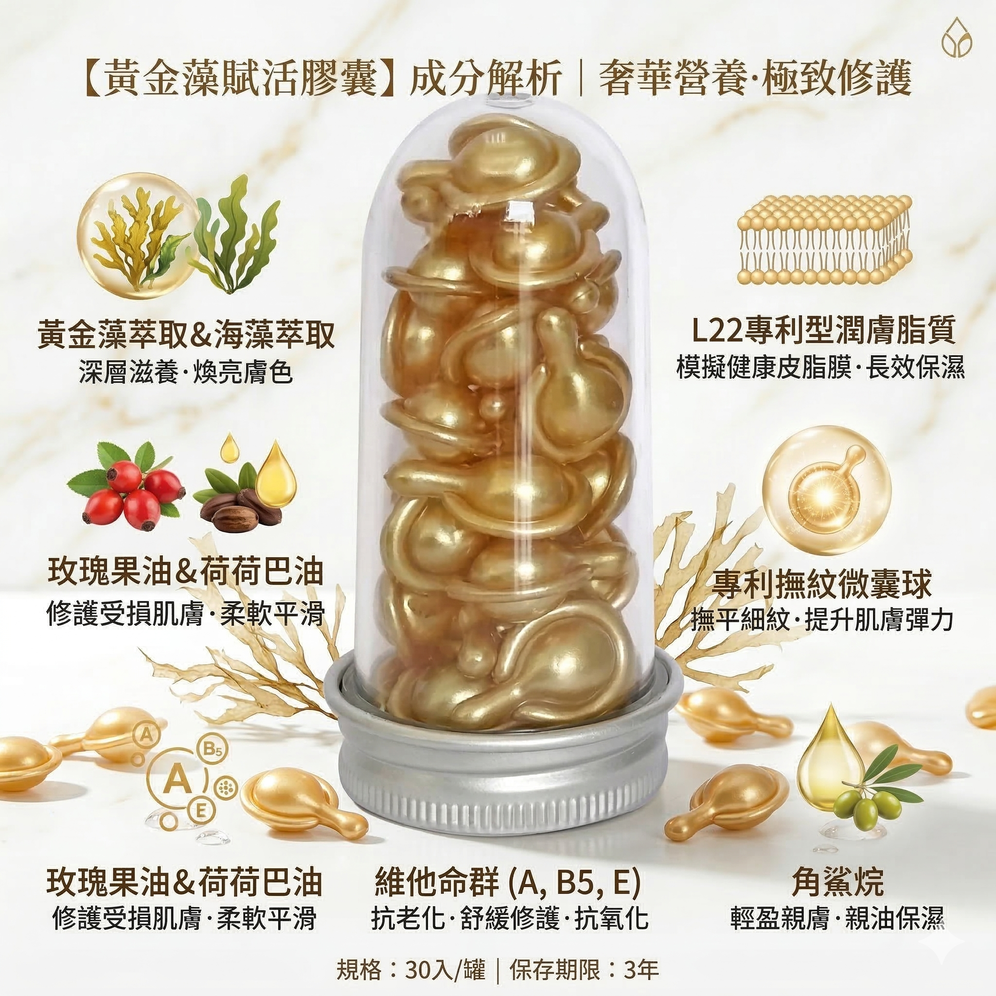 成分:黃金藻富含多種營養素,如L22專利型潤膚脂質、玫瑰果油、維他命A醇、維他命B5、維他命E、黃金海藻萃取、專利撫紋微囊球、角鯊烷、荷荷巴油